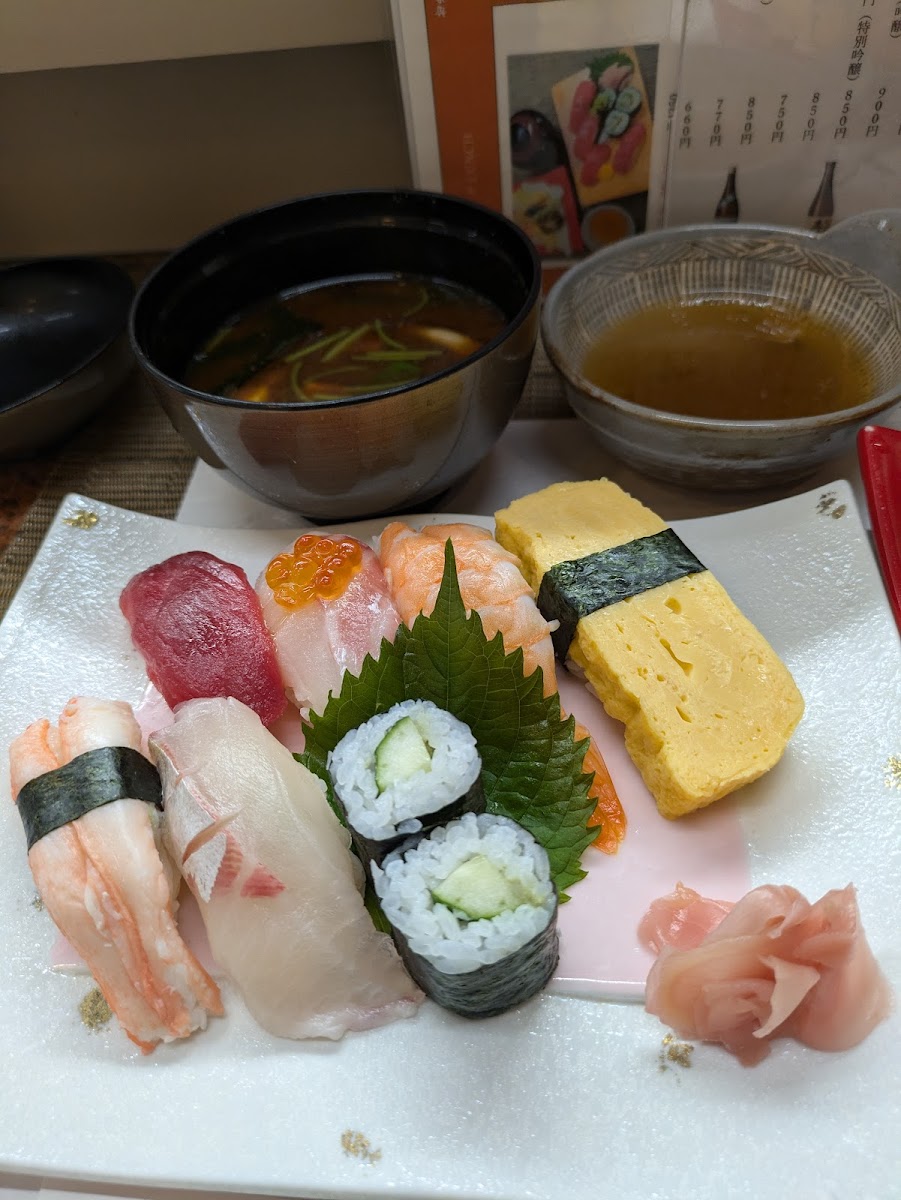Perfect spot for a fixed menu lunch. The best sushi I’ve had in Kyoto thus far. Tuna was perfect, fried tempura veggies and shrimp paired perfectly, and the miso soup was the best I’ve had. Definitely worth the stop.